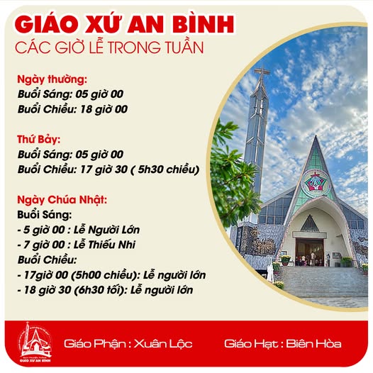 Xưởng Tượng Gỗ Công Giáo chúng con xin cập nhật Giờ Thánh Lễ Tại Giáo Xứ An Bình, Giáo Phận Xuân Lộc, để quý ông bà sắp xếp thời gian tham sự Thánh lễ đúng giờ. Những thay đổi về giờ lễ trong những ngày lễ Trọng sẽ được cập nhật sau.